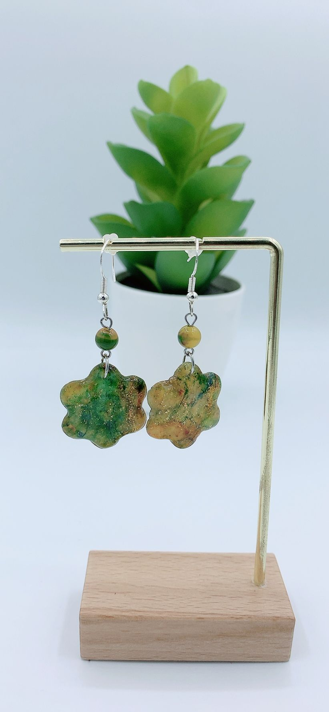 Ces boucles d'oreilles sont fabriquées en Argile Polymère, un matériau léger et durable qui permet une grande variété de designs et de couleurs. Chaque paire est soigneusement façonnée à la main, peinte ou teintée avec soin, offrant ainsi un aspect unique et artistique. Pour la finition, une couche de résine est appliquée afin de garantir la vivacité des couleurs et de protéger la création.