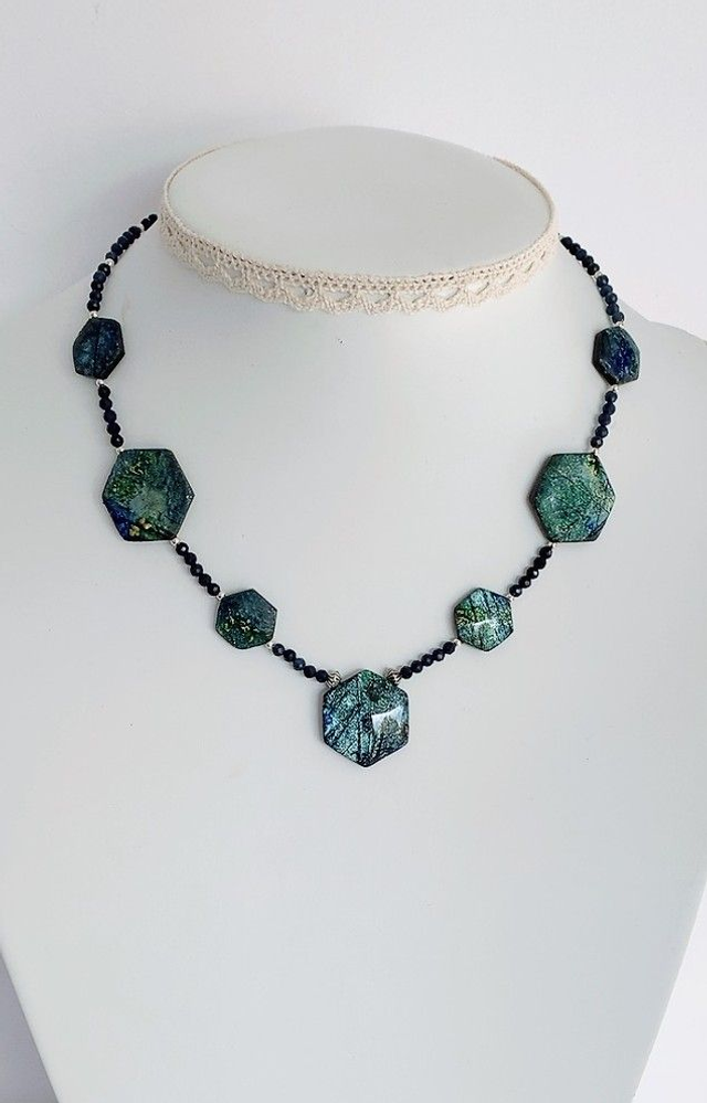 Ajoutez une touche unique à votre collection de bijoux avec notre collier peint à la main et accompagné de pierres . Chaque pièce est soigneusement peinte à la main avec des peintures métallisées, offrant des reflets brillants et éclatants qui ne manqueront pas d'attirer les regards. Le design original et artistique de ce collier en fait un accessoire parfait pour toutes les occasions, qu'il s'agisse d'une sortie décontractée ou d'un événement plus habillé.