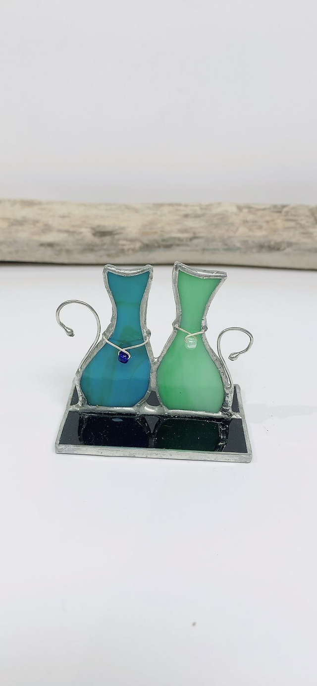 Découvrez notre magnifique Couple de Chats en verre de vitrail, une pièce artisanale unique qui apportera une touche de charme et d'élégance à votre décoration. Cette pièce est soigneusement réalisé à la main, utilisant des techniques traditionnelles de vitrail dite "Tiffany" pour créer une œuvre d'art lumineuse et colorée.