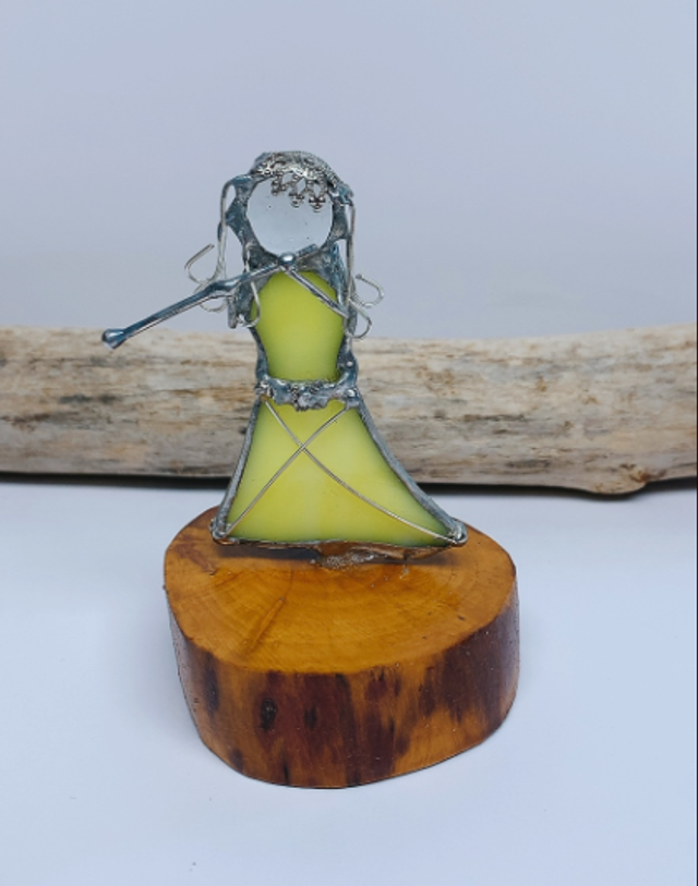 Ajoutez une touche d'élégance artistique à votre intérieur avec notre personnage en vitrail. Réalisé avec soin, cette réalisation combine des morceaux de verre aux couleurs vibrantes , du fils de cuivre argenté et de l'éteins, créant ainsi une œuvre d'art unique et lumineuse.