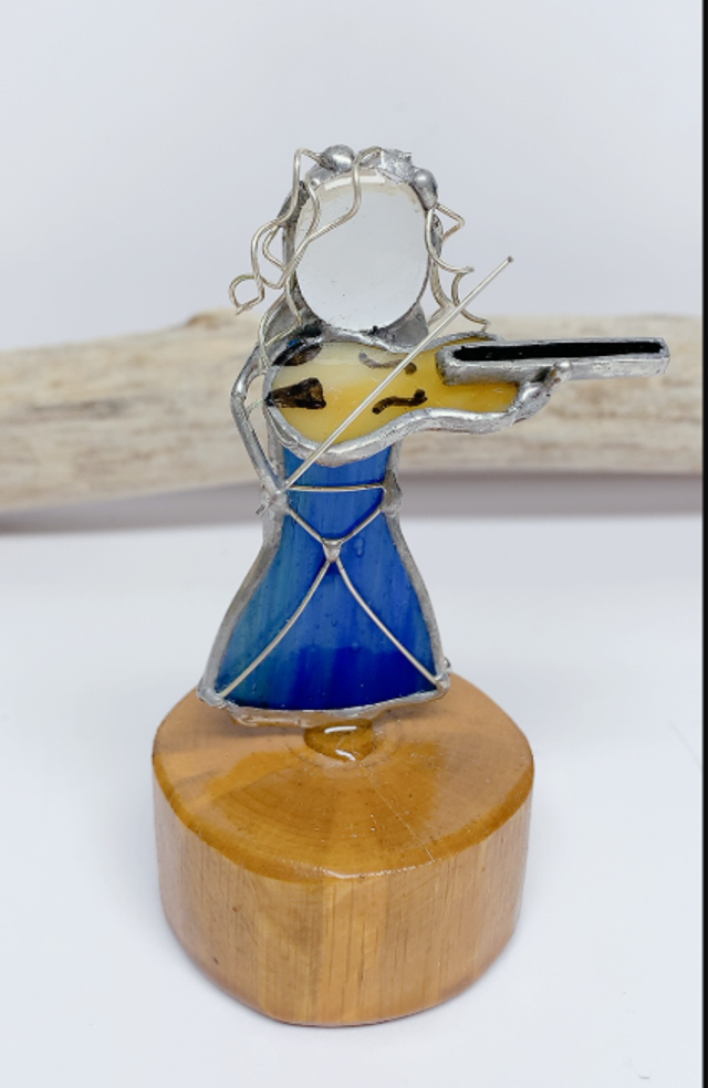 Ajoutez une touche d'élégance artistique à votre intérieur avec notre personnage en vitrail. Réalisé avec soin, cette réalisation combine des morceaux de verre aux couleurs vibrantes , du fils de cuivre argenté et de l'éteins, créant ainsi une œuvre d'art unique et lumineuse.