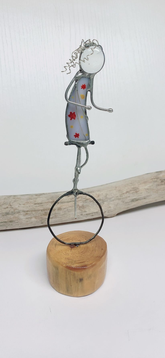 Ajoutez une touche d'élégance artistique à votre intérieur avec notre personnage en vitrail. Réalisé avec soin, cette réalisation combine des morceaux de verre aux couleurs vibrantes , du fils de cuivre argenté et de l'éteins, créant ainsi une œuvre d'art unique et lumineuse.